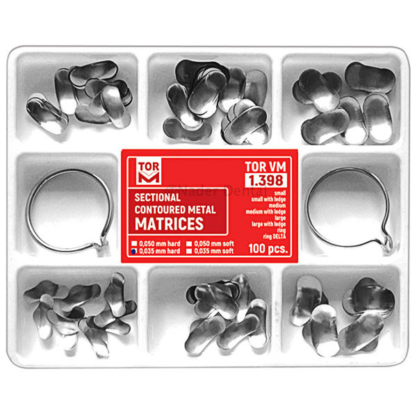 کیت سکشنال ماتریکس 100 عددی و 2 عدد کلمپ - Tor VM سکشنال ماتریکس دارای 100 نوار ماتریکس سکشنال در دو ضخامت 35 و یا 50 میکرون و از نوع سخت می باشد. این کیت شامل : * 10 عدد نوار ماتریس سکشنال کوچک لژ دار * 20 عدد نوار ماتریس سکشنال کوچک * 20 عدد. این کیت شامل : عدد نوار ماتریس سکشنال کوچک لژ دار عدد نوار ماتریس سکشنال کوچک عدد نوار ماتریس سکشنال بزرگ عدد نوار ماتریس سکشنال بزرگ لژ دار عدد نوار ماتریس سکشنال متوسط لژ دار عدد نوار ماتریس سکشنال متوسط می باشد.