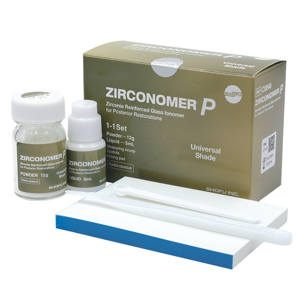 مشخصات کلی نام کالا گلاس آینومر برند Shofu (شوفو) نام تجاری Zirconomer P کشور سازنده ژاپن نوع مصرف دائم نوع ترمیمی سلف کیور مواردِ مصرف ترمیم های کلاس ۱ و ۲، ترمیم اصلاح شده نقره، ترمیم های کودکان و سالمندان، کوربیلدآپ، بیس و ... روش کیورینگ سلف کیور زمان مخلوط کردن