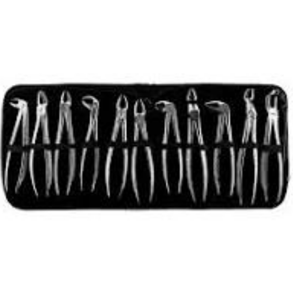 کارایی : این ست جهت کشیدن دندان ها مورد استفاده قرار میگیرد ست 11 عددی شامل: سانترال بالا-مولر پایین-مولر بالا راست-مولر بالا چپ-پرمولر پایین-پرمولر بالا-عقل بالا-عقل پایین-ریشه کش پایین-ریشه کش بالا-کاهورن پایین. طول فورسپس:15 -18 سانتی متر طول کاربردی فورسپس: 2-4 سانتی متر