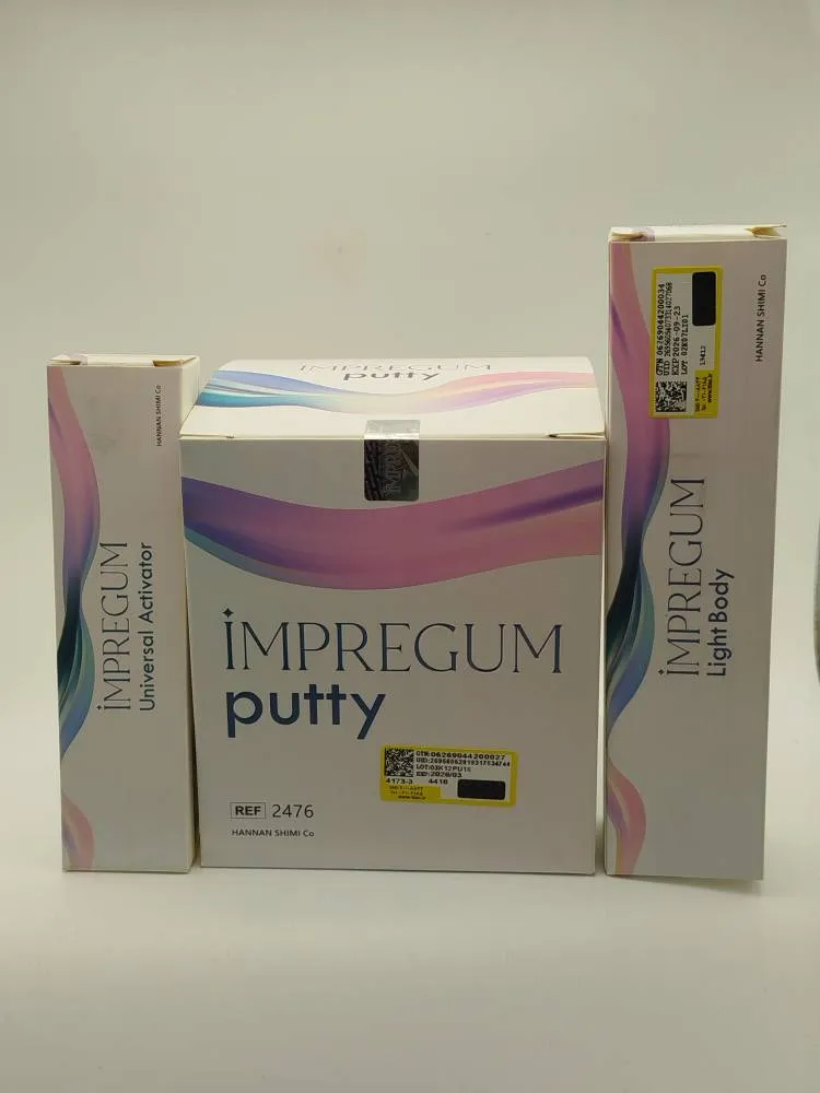 ست قالبگیری C سیلیکون IMPREGUM : پوتی 910 میل ( با طعم نعنا ) لایت بادی 120 میل ( با طعم پرتقال ) اکتیواتور 60 میل دارای بالاترین دقت بر روی جزئیات مدلهای قالبگیری پایداری ابعادی در مدت زمان طولانی زمان گیرش بهینه کارپذیری مناسب جهت انجام مراحل مختلف قالبگیری از نوع C Silicon و متریال و تکنولوژی BLUESTAR آلمان انعطاف پذیری و ترشوندگی عالی