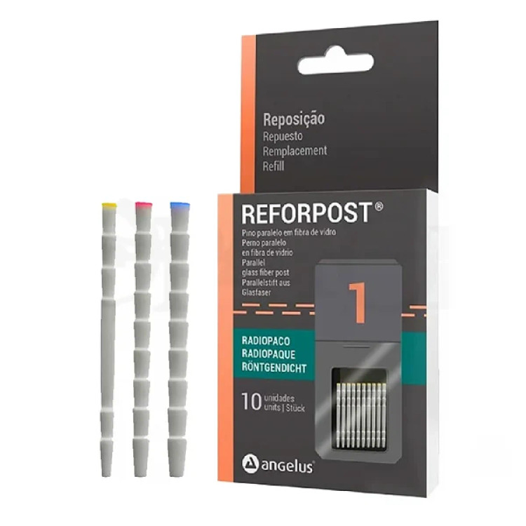 فایبر پست Reforpost آنجلوس (Angelus) برای بازسازی دندانهایی که در معرض نیروهای جانبی و حرکات طرفی قرار دارند، مانند دندانهای کانین و پرمولر، طراحی شده است. این پست از الیاف طولی مقاوم ساخته شده که موجب افزایش استحکام و توزیع بهتر نیرو در ساختار دندان میشود. طراحی آن به گونهای است که حداقل سایش در ناحیه اپیکال ریشه ایجاد میکند. وجود رشته فلزی در مرکز پست باعث ایجاد رادیواپسیته مناسب شده و مشاهده آن را در رادیوگرافی آسان میکند. برای آمادهسازی کانال میتوان از پیزوریمر بهعنوان دریل استفاده کرد و طراحی دندانهدار سطح پست نیز باعث ایجاد گیر مکانیکی بهتر با سمان میشود. این محصول در سایزهای 1، 2 و 3 عرضه شده و هر بسته شامل 10 عدد فایبر پست است.